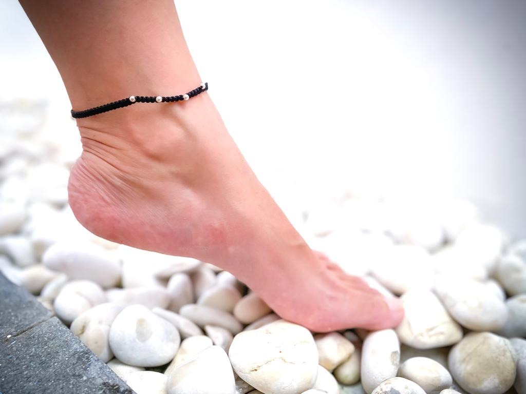 ハンドメイドで丁寧に編み込まれたコードとシルバービーズが組み合わせられたBeaided Five Ball Anklet。