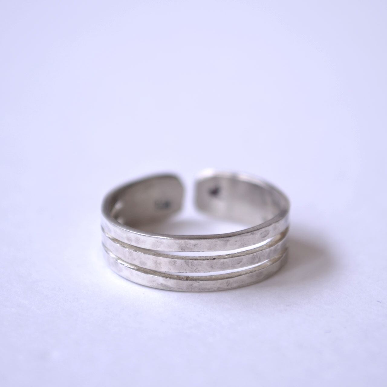 3連に見えるデザインのシンプルなオープンリング。マナナスらしい表面のハンマー加工で雰囲気のある上品な仕上がりとなっています。軽くて滑らかな着け心地なので、毎日着用できるリングです。コーディネートを選ばない男女ともにおススメのアイテムです。