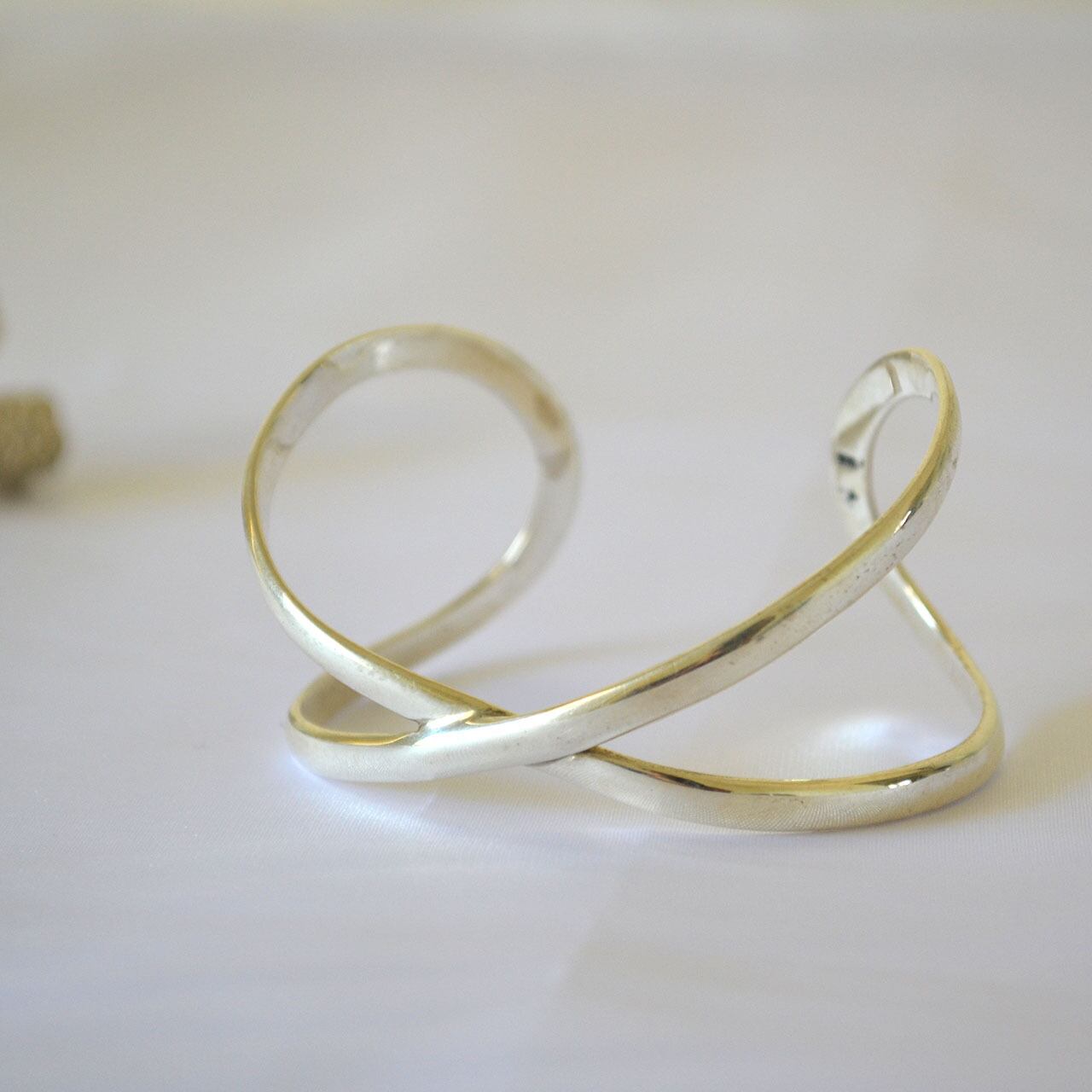クロスデザインのレディースバングル。流れるような滑らかなデザインが特徴です。程よいボリューム感で軽やかな着け心地です。手元のアクセントとして幅広いコーディネートに着用できるバングルです。