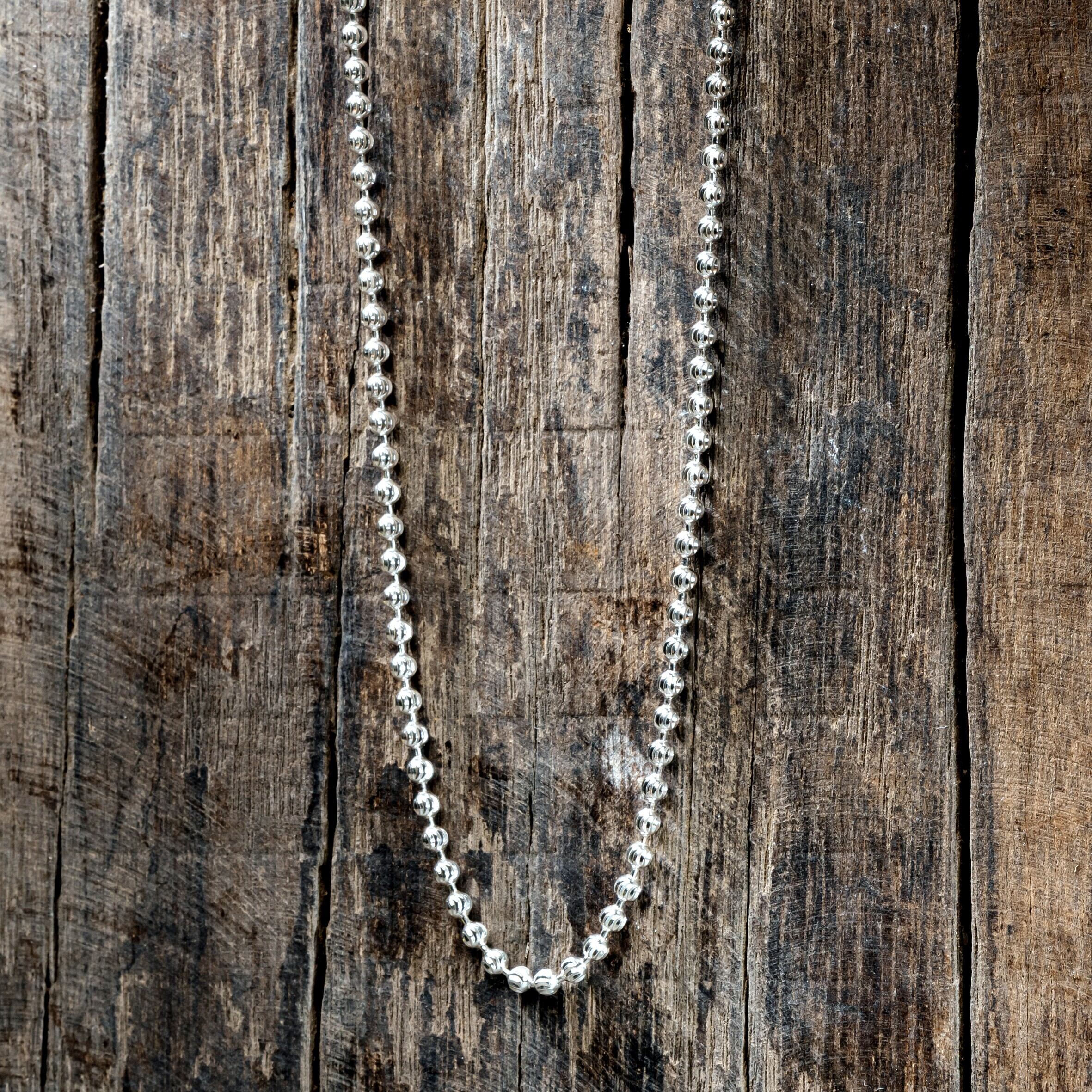 切込みの入った独特な形状のFacet Ball Chain。通常のボールチェーンより上品でエレガントな表情が特徴のマナナス定番のネックレスです。程よいボリューム感で男女問わず幅広いコーディネートに着用できるアイテムです。ユニセックスアイテム。