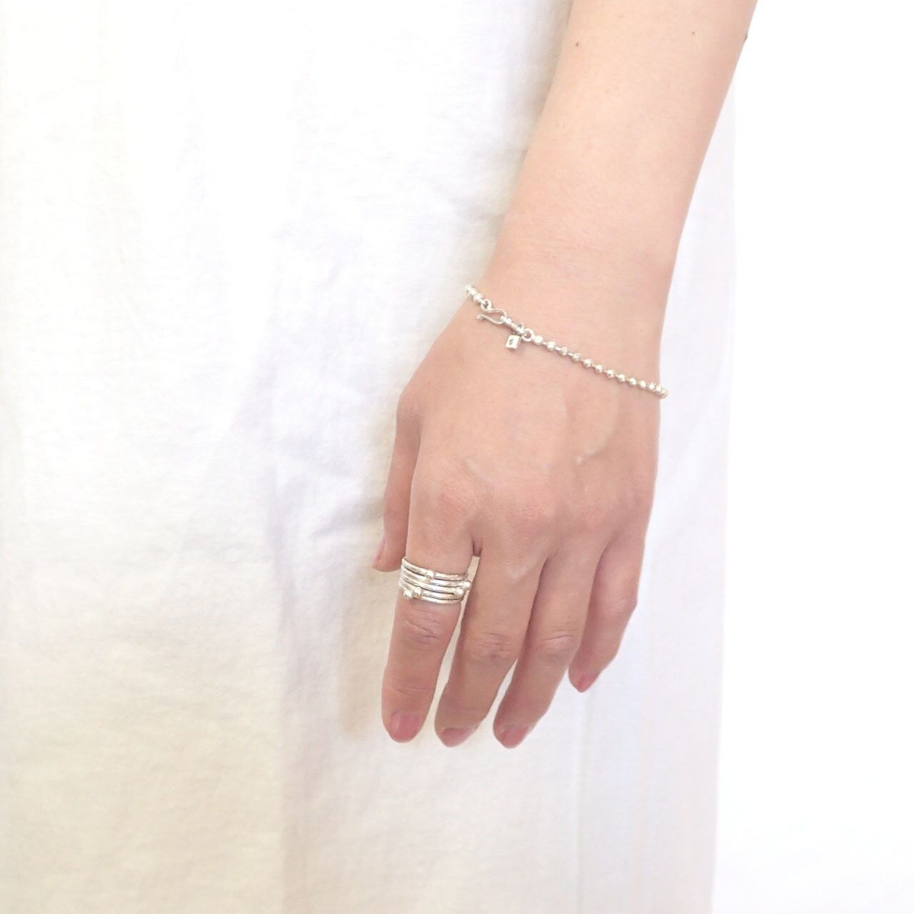 切込みの入った独特な形状のFacet Ball Chain Bracelet。通常のボールチェーンより上品でエレガントな表情が特徴です。シンプルなデザインと程よいボリューム感で、さらりと単品で着けても、他のアイテムとの重ね付けにも重宝するブレスレットです。ユニセックスアイテム。