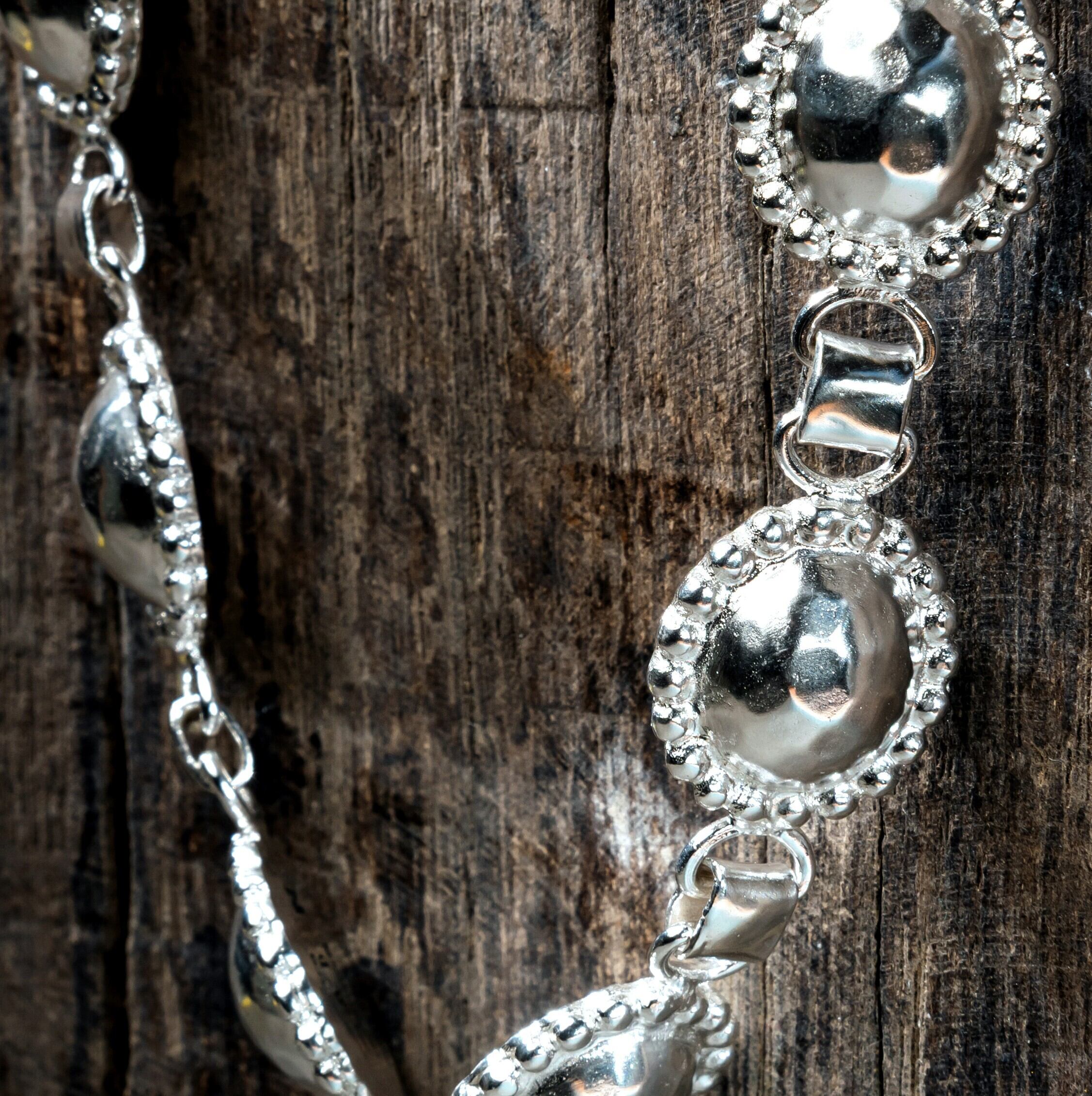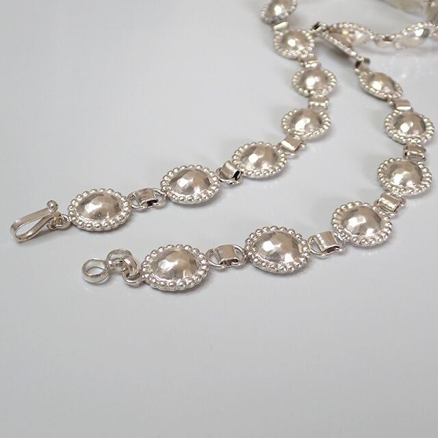 ずっしりとした重量感のあるコンチョネックレス。コーディネートのアクセントにぴったりな存在感があり、目をひくアイテムです。表面の雰囲気のあるハンマー加工が、表面はもちろん裏面にも施されています。見た目以上に着こなしを選ばず着用でき、男女ともにながく愛用できる一本です。