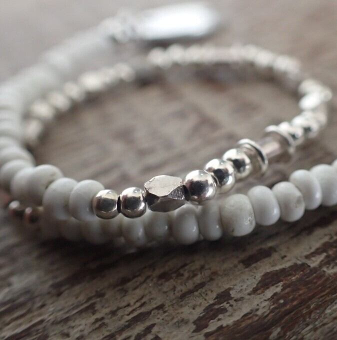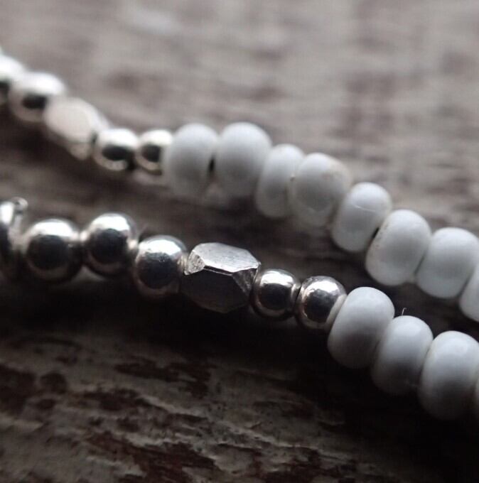 アンティークのホワイトビーズと様々な形のシルバービーズを使用。真っ白過ぎず、小さ目サイズのビーズとシルバーミックスビーズとのコンビネーションが魅力のブレスです。